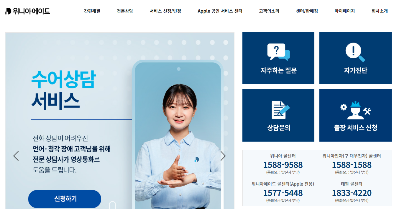 위니아 홈페이지를 통해 사전점검을 선택하고 예약신청 하시면 됩니다. 출장서비스 예약은 위니아 고객센터 1588-9588에서 상담원이나 자동응답예약을 통해 예약할 수 있습니다.