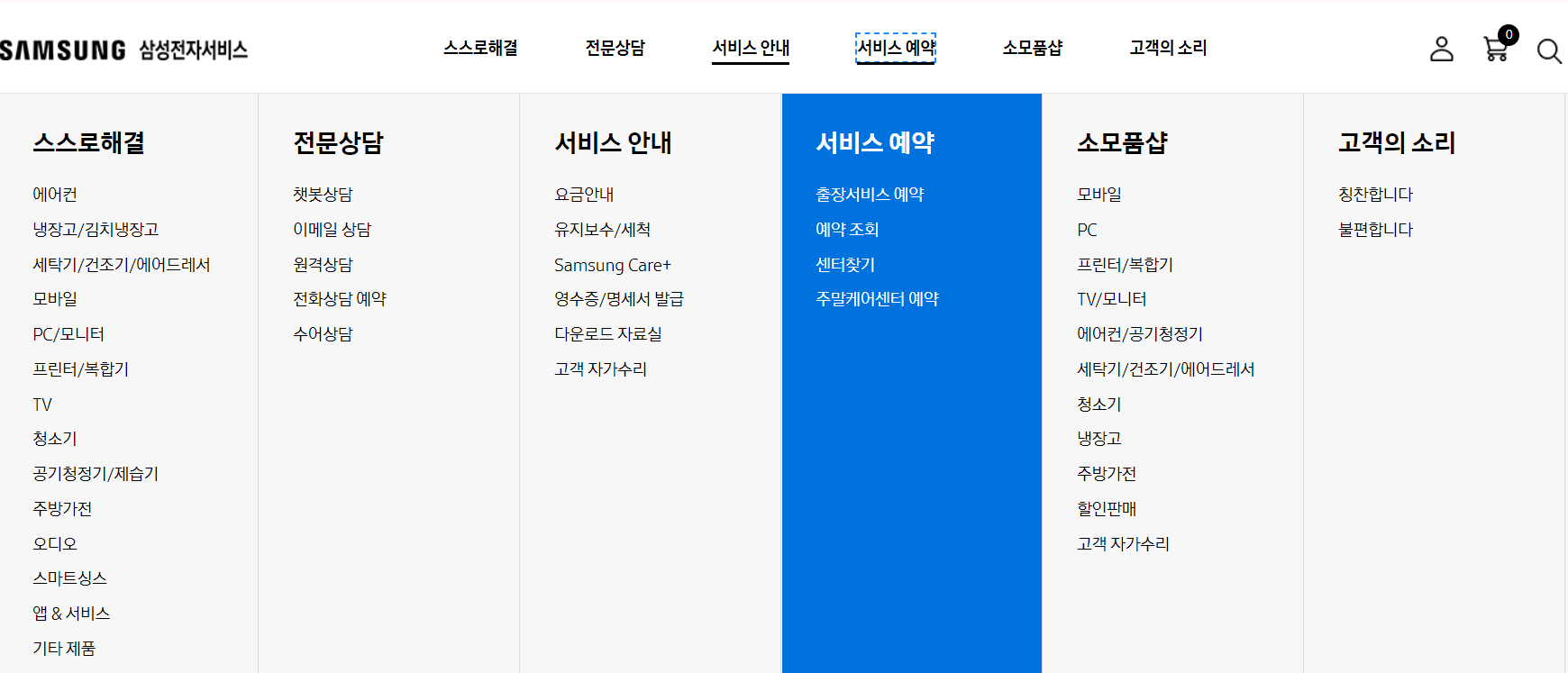 예약할 때는 위의 홈페이지 사진과 같이 출상서비스 예약을 선택하고 고장증상은 사전점검을 선택한 후 절차에 따라 신청하시면 됩니다.