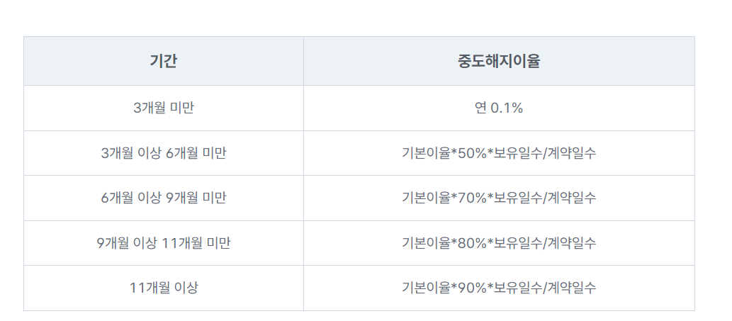 표를 참고하시고 아래에서 간단하게 중도해지 계산기를 사용해 보세요. 하지만 은행마다 기준이 다르기 때문에 정확한 내용은 가입한 은행에 꼭 확인하시고 참고자료로 계산해 보시면 됩니다.