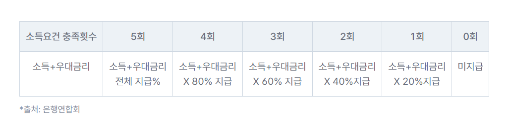 청년도약계좌는 저소득 청년을 위한 추가 이자 지원을 합니다. 신청시점이나 가입 후 1년을 주기로 심사를 하여 개인소득금액의 소득요건과 충족 횟수에 따라 우대금리를 적용합니다.