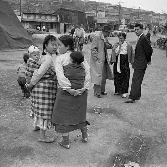 원조 물자를 재활용하여 만든 체크 무늬 한복은, 당시의 한정된 자원과 창의성이 어우러진 결과물입니다.